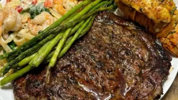 Smoked ribeye with a lobster tail, asparagus, garlic toast and shrimp