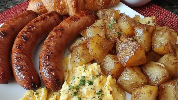 Hearty Breakfast Plate with Sausage Patties, Scrambled Eggs, Home Fries & Croissant