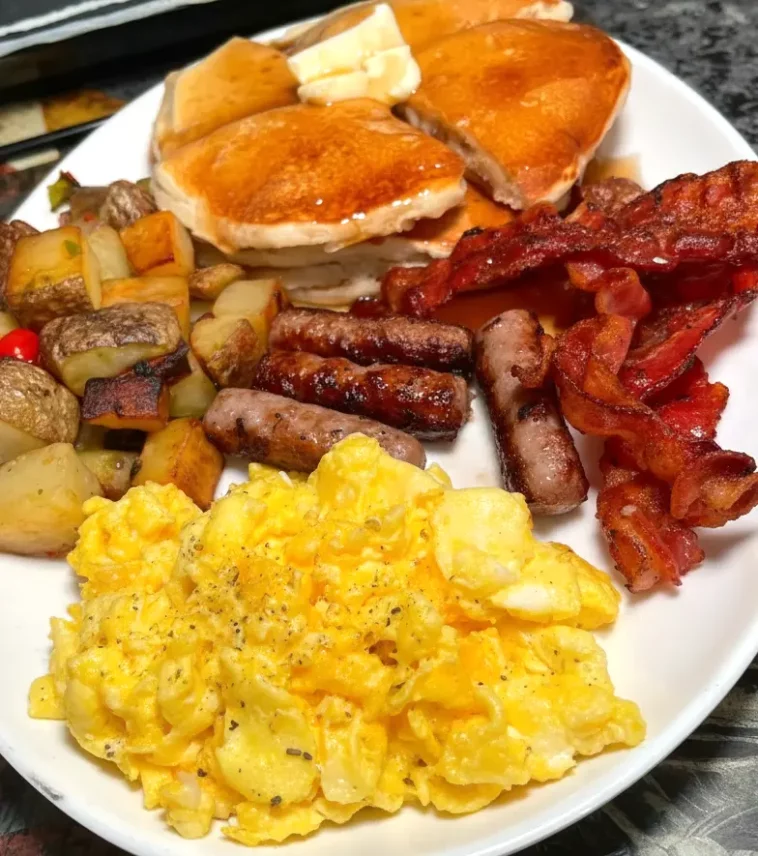 A true country breakfast like this is all about warmth, comfort, and starting the day with something hearty and satisfying. This plate gives you everything you want in a classic morning feast: fluffy pancakes dripping with butter and syrup, soft and creamy scrambled eggs, crispy bacon, juicy breakfast sausages, and golden home fries cooked with peppers and onions. It’s the kind of breakfast that fills the kitchen with the smells of sizzling bacon, golden pancakes on the griddle, and potatoes browning in the skillet the perfect combination to make anyone feel at home.