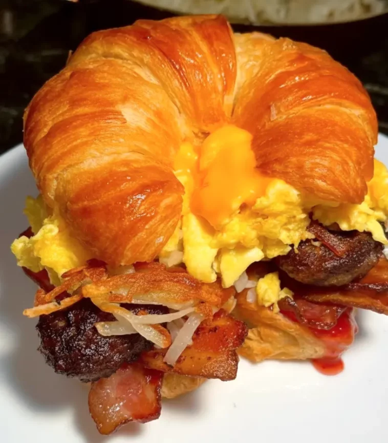 What makes this sandwich so irresistible is the contrast of textures. The croissant flakes gently as you bite into it, followed by soft, custardy eggs that are cooked low and slow to stay tender. The bacon adds a smoky crunch, while the sausage delivers deep, savory flavor that balances the richness of the eggs and pastry. Melted cheese tucked into the center adds creaminess and ties everything together, while lightly caramelized onions or hash-brown-style potatoes add an extra layer of comfort and heartiness. A small drizzle of ketchup or hot sauce gives just enough acidity to cut through the richness without overpowering the sandwich.