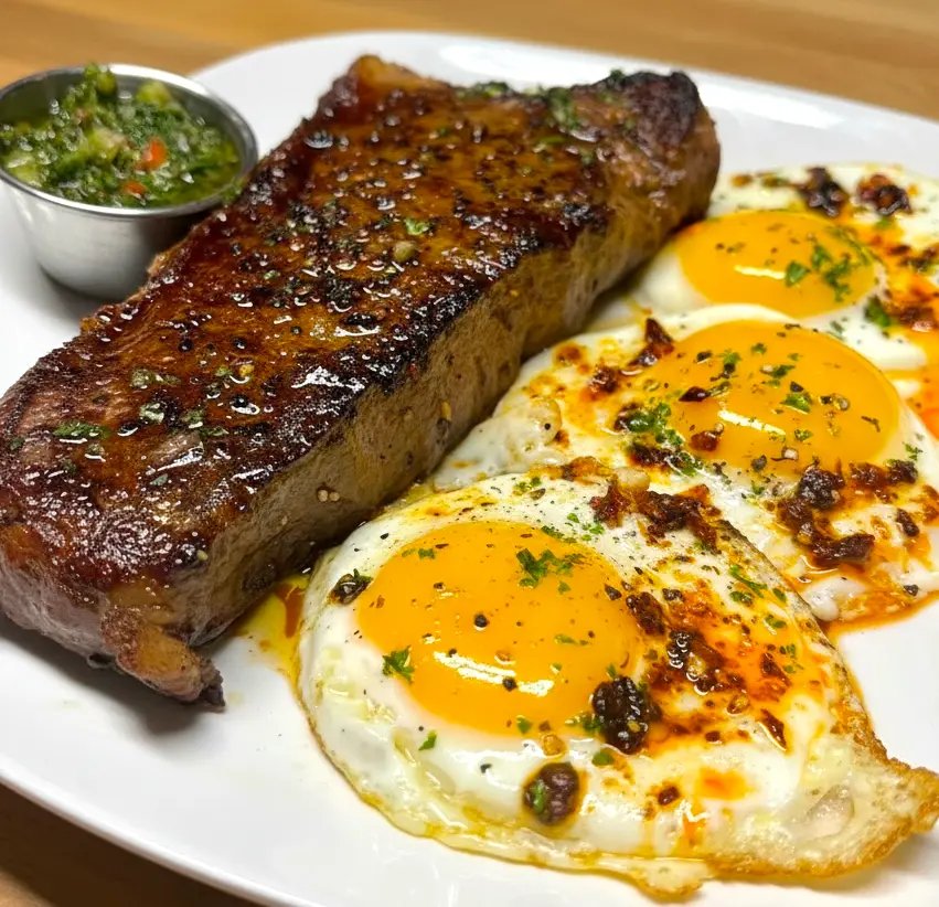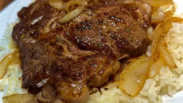 Pan-Seared T-Bone Steak with Peppers, Onions & Fries