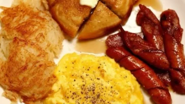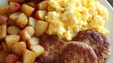 Hearty Breakfast Plate with Sausage Patties, Scrambled Eggs, Home Fries & Croissant