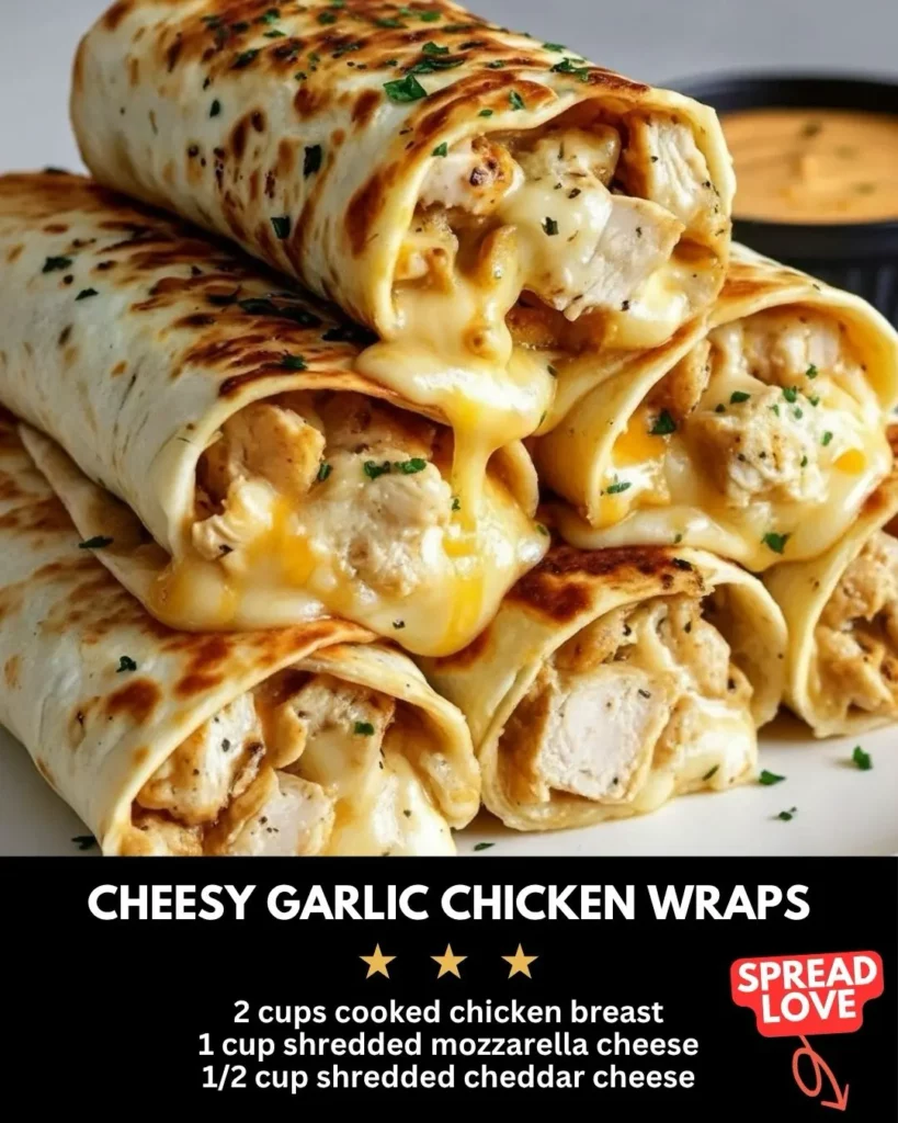 Cheesy Garlic Chicken Wraps are a delectable and satisfying meal that brings together the best of comfort food in a convenient, handheld format. This recipe is perfect for busy weeknights, casual gatherings, or even a quick lunch, as it combines tender, flavorful chicken with gooey cheese and aromatic garlic, all wrapped up in a soft tortilla. The beauty of these wraps lies not only in their delicious taste but also in their versatility; you can easily customize the ingredients to suit your preferences or use up leftovers.