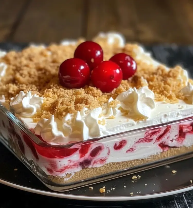 This dessert is often called a “lush” because of its multiple creamy layers that come together to create a melt-in-your-mouth texture. The combination of the crumbly crust, silky cheesecake, and juicy cherries makes it both refreshing and indulgent. Whether you serve it as a Sunday treat, a family dessert, or a potluck favorite, it’s guaranteed to impress with its vibrant colors and irresistible flavor.