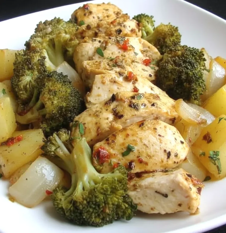 Chicken with Potatoes & Broccoli is the perfect example of how simple ingredients can come together to create a wholesome, comforting, and incredibly flavorful meal. The photo you shared captures everything wonderful about this dish: tender chicken pieces seasoned with herbs and spices, soft golden potatoes that absorb all the savory juices, and broccoli florets that roast into slightly crisp, deeply flavored bites. It’s a full meal cooked in one pan, which makes it ideal for busy weeknights, meal prep, or anyone who wants a nutritious dinner without a lot of cleanup. What makes this recipe so satisfying is how the flavors blend as everything cooks together chicken juices mingle with the potatoes, the broccoli absorbs the garlic and seasonings, and the onions add just the right hint of sweetness.