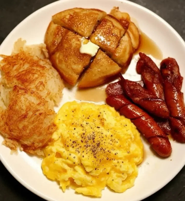 This classic breakfast plate is the definition of comfort food done right, bringing together sweet, savory, crispy, and fluffy elements in one satisfying meal. Golden French toast sits at the heart of the plate, pan-fried until caramelized on the outside and soft on the inside, then finished with melting butter and warm syrup that soaks into every slice. It delivers that perfect balance of sweetness and richness that makes breakfast feel special, whether it’s a weekend brunch or a cozy morning at home.