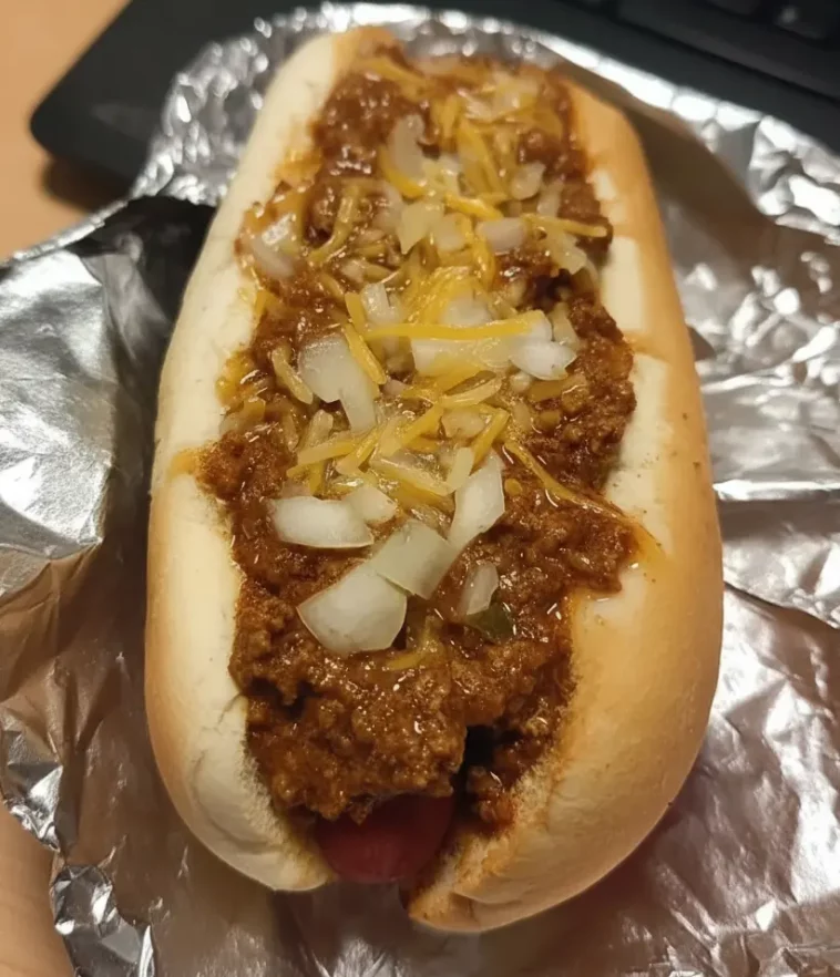 This type of chili is not meant to be chunky. It doesn’t include beans, large tomato pieces, or vegetables like a traditional pot of chili. Instead, everything is simmered until the sauce becomes velvety and thick, with a deep, almost smoky flavor profile that pairs perfectly with hot dogs. The sauce in your photo looks exactly right — a deep reddish-brown, glossy, meaty topping with just enough moisture to stay juicy, finished off with chopped onions and melted cheese. That’s the classic presentation: a soft bun, a grilled or steamed hot dog, a generous ladle of chili, and fresh onions or cheese on top.