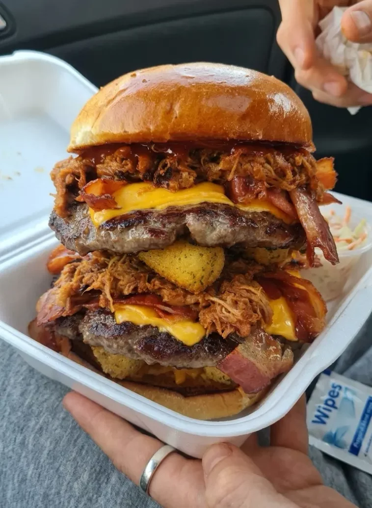 This style of stacked burger is especially popular in American comfort food culture, particularly in states known for bold barbecue like Texas. The BBQ pulled pork adds slow-cooked richness, while the mozzarella sticks bring that dramatic cheese pull that makes for incredible food content. When you slice into it, you get layers of beef, pork, and melted cheese cascading together pure visual impact.