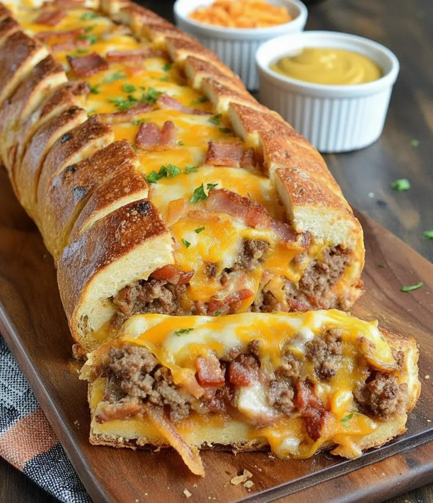 Garbage Bread is a bold, over-the-top comfort food that lives up to its fun name. Despite how it sounds, there’s nothing “garbage” about it—this dish is packed with savory ground beef, crispy bacon, melted cheese, and classic burger-style flavors all wrapped inside a golden, crusty loaf of bread. It’s essentially a cheeseburger baked inside bread, sliced and served like a stuffed loaf, making it perfect for parties, game days, or casual family dinners. One look at that gooey cheese pull and hearty filling, and everyone at the table knows they’re in for something indulgent.