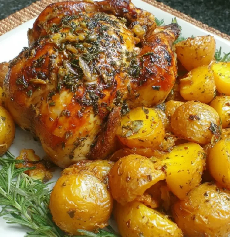 There’s something incredibly comforting about a classic garlic roasted chicken served alongside golden, herb-roasted potatoes. It’s the kind of dish that fills the entire home with warmth and rich, savory aromas garlic sizzling in butter, rosemary releasing its earthy fragrance, and chicken skin crisping to a deep, beautiful golden brown. This dish is wonderfully rustic, simple enough for a weeknight dinner yet impressive enough for a special family meal or weekend gathering. The magic lies in letting fresh ingredients shine: whole chicken seasoned generously, baby potatoes absorbing all the pan juices, and herbs coming together to create layers of flavor that taste like home.