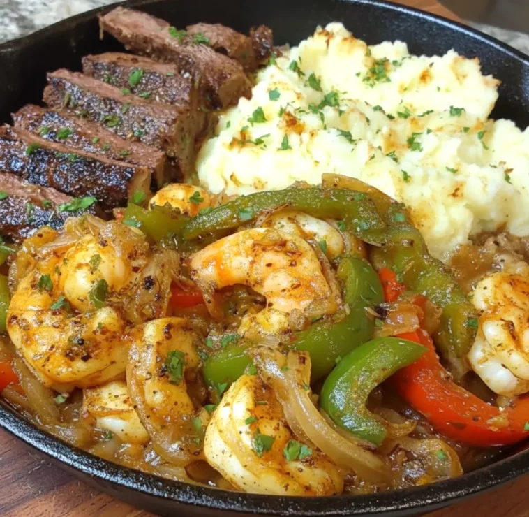 A grilled steak and shrimp skillet with mashed potatoes is the kind of meal that feels indulgent, comforting, and restaurant-quality all at once. It brings together surf-and-turf richness with homestyle warmth, giving you bold flavors and satisfying textures in every bite. The steak provides a deep, smoky char on the outside while staying tender and juicy inside. When sliced and arranged over creamy mashed potatoes, it creates a perfect combination of hearty and melt-in-your-mouth comfort. The shrimp adds a completely different layer of flavor light, slightly sweet, and coated with butter, garlic, and spices that soak beautifully into the peppers and onions. This combination makes every bite flavorful, vibrant, and balanced.