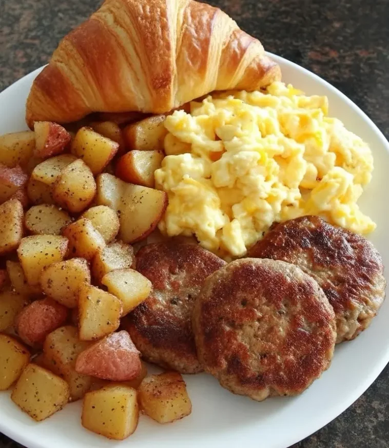 The sausage patties are pan-seared until deeply browned on the outside and juicy on the inside, delivering bold, savory flavor in every bite. Soft, creamy scrambled eggs add richness and pair beautifully with the sausage, especially when cooked gently with a touch of butter. Golden home fries bring a satisfying crisp texture, seasoned simply with salt and pepper so the natural potato flavor shines. A warm, flaky croissant completes the plate, adding a buttery contrast that ties everything together and makes the meal feel extra special.