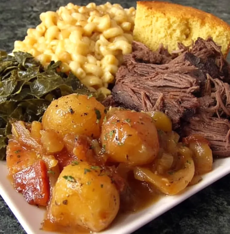 A classic Southern comfort plate like this is the kind of meal that brings warmth, nostalgia, and pure satisfaction to the table. Each component offers its own incredible texture and flavor, yet they all complement each other beautifully. Creamy mac and cheese gives you that rich, velvety bite that instantly feels indulgent. The collard greens add a deep, savory, slow-cooked earthiness that balances the richness of the macaroni. The sweet potato potatoes are tender, slightly sweet, and coated in a glossy, seasoned glaze that makes every forkful comforting and soulful. And of course, no true Southern plate is complete without a slice of warm, golden cornbread the perfect finishing touch that soaks up all the juices and ties everything together.