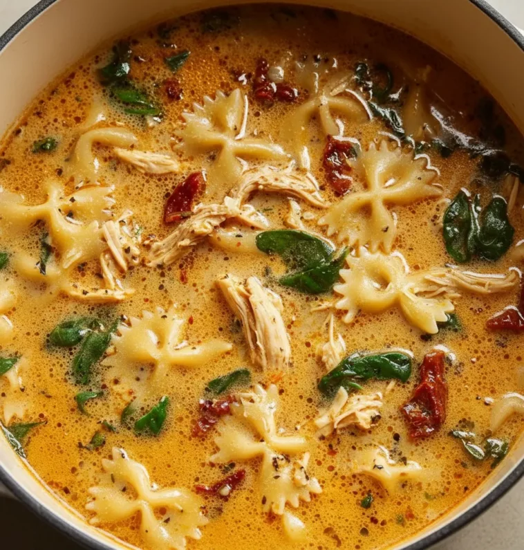 The flavor of this soup is all about balance. The chicken simmers until perfectly tender, soaking up the savory broth and seasonings. Sun-dried tomatoes add a slightly sweet, tangy depth that cuts through the creaminess, while garlic, Italian herbs, and a touch of chili flakes give it warmth and complexity. Parmesan cheese melts into the broth, creating a silky, rich texture that coats every spoonful without feeling heavy. The result is a soup that’s comforting, bold, and deeply satisfying.