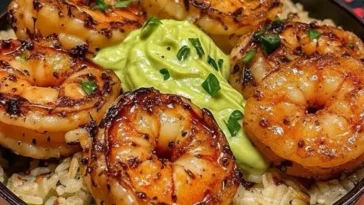 Lemon Garlic Shrimp Rice Bowls with Avocado Cilantro Cream