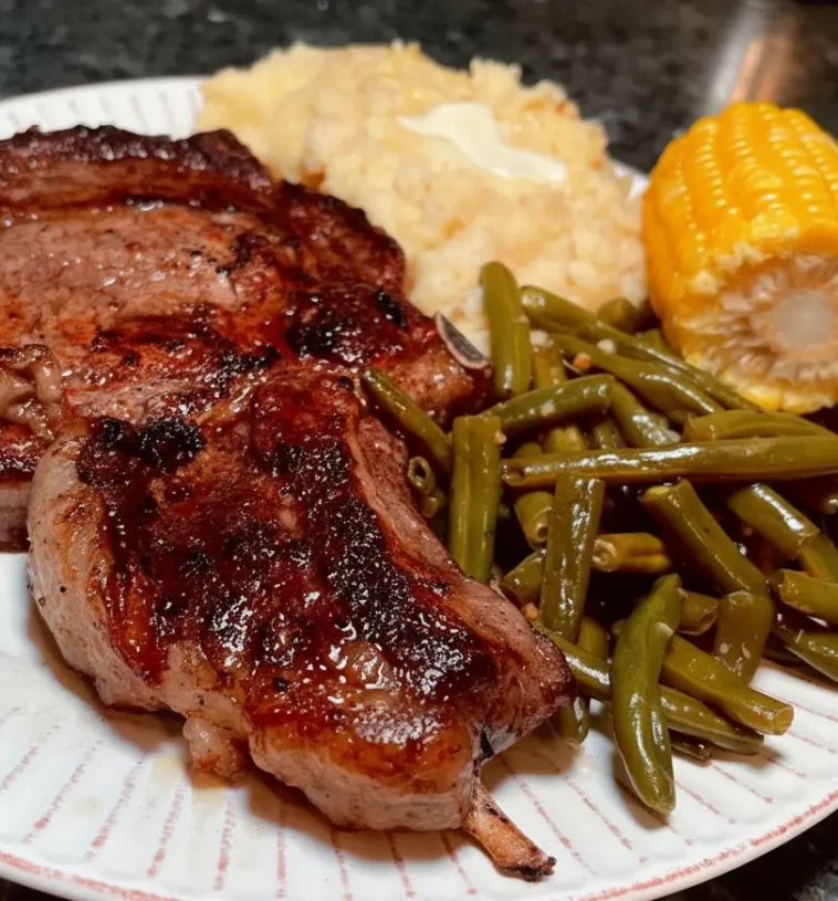 A classic Southern comfort plate doesn’t need to be complicated to be unforgettable, and this meal is the perfect example. These pan-seared pork chops are cooked until beautifully browned on the outside while staying juicy and tender on the inside. When done right, a pork chop develops that deep caramelized color you see in the picture slightly crispy edges, rich flavor, and a buttery finish that makes every bite satisfying. The seasoning isn’t overly fancy; it’s all about balance: a little salt, pepper, garlic, and paprika to enhance the natural flavor of the meat. When the chops hit a hot skillet, they sizzle immediately, creating that delicious seared crust that locks in moisture and makes them incredibly flavorful.