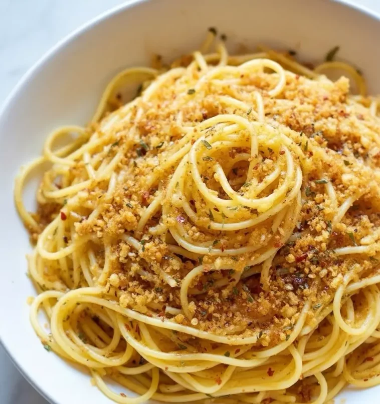 But what truly elevates this simple creation is the crunch. The toasted breadcrumbs, sometimes called pangrattato, are essential to the experience.2 They are pan-fried until golden and crunchy, providing a delightful textural contrast to the tender pasta.3 In traditional Italian cooking, this component was often referred to as “poor man’s Parmesan” because its savory, crunchy quality was a fantastic substitute for expensive cheese. When you toss the warm pasta in the luscious garlic oil, and then sprinkle it generously with the crunchy, seasoned breadcrumbs, you achieve a harmonious balance of flavors and textures that is truly addictive. It’s a vegan-friendly dish that can easily be dressed up with a touch of lemon zest for brightness or a pinch of red pepper flakes for heat. If you are a food blogger or home cook looking for a recipe that consistently delivers on taste, speed, and elegance, mastering this vibrant pasta with garlic oil and breadcrumbs is a game-changer. It’s comforting, sophisticated, and proof that a few high-quality, simple ingredients can create a profound culinary moment.