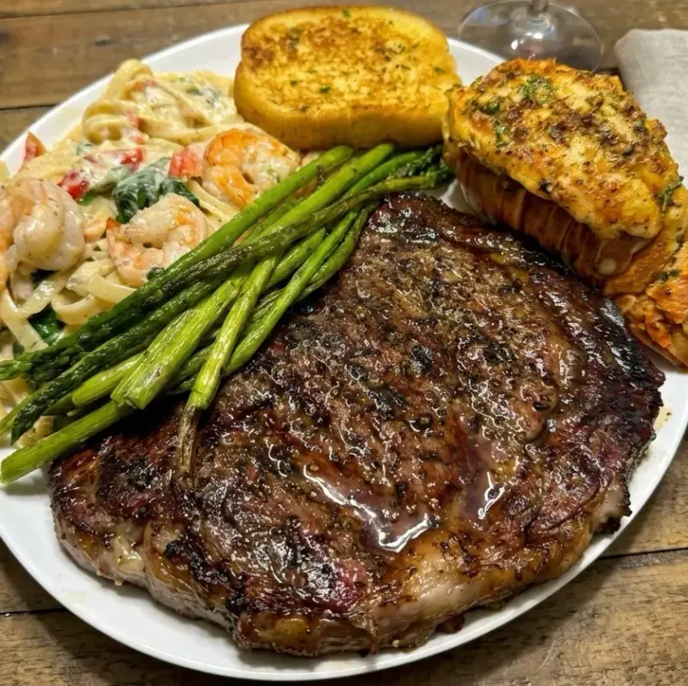 What makes this dish truly stand out is the combination of cooking techniques. Smoking the ribeye infuses it with a subtle wood-fired flavor that you can’t achieve with a regular pan. Meanwhile, the lobster tail is gently cooked in butter to keep it tender and juicy, and the shrimp are quickly sautéed to lock in their natural sweetness. The asparagus adds freshness and balance, while the garlic toast soaks up all those delicious juices on the plate.