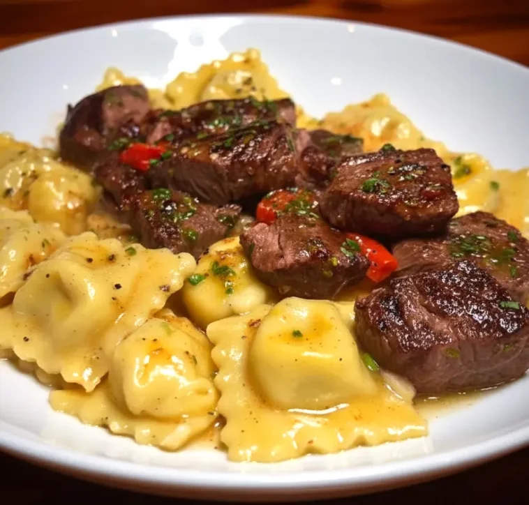 Steak cuts with cheese ravioli in garlic butter is a beautifully rich, comforting dish that brings together the best of both worlds tender, juicy steak and silky, cheesy pasta. What makes this meal so satisfying is the balance between bold, savory flavors and creamy, buttery textures. The steak is seared until caramelized on the outside while remaining tender inside, giving each bite a deep, satisfying flavor. When the meat is cut into bite-sized pieces, it becomes even easier to enjoy alongside the ravioli, allowing you to get steak and pasta together in a single forkful.