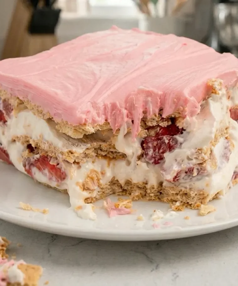 What makes this dessert so special is the way the graham crackers soften as it chills, creating a cake-like texture without any baking. The creamy filling, made with instant vanilla pudding and whipped topping, becomes light and fluffy while still rich. Fresh strawberries add natural sweetness and a pop of color, making every slice beautiful and vibrant. After a few hours in the refrigerator, everything sets into neat, sliceable layers that hold together perfectly.