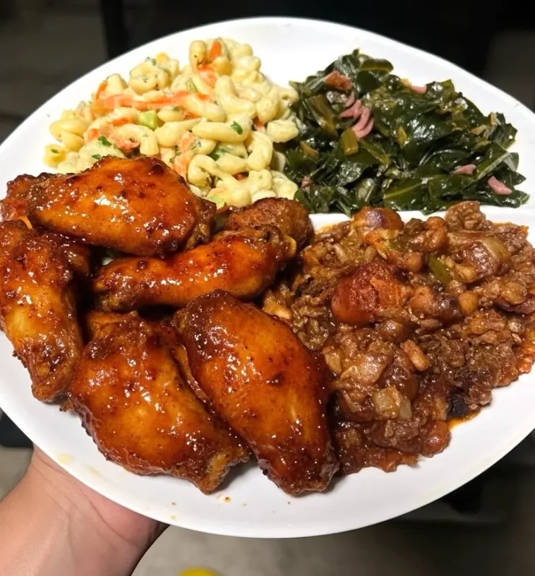 Wings with Hawaiian Mac Salad, fresh greens, and cowboy beans make a bold, crowd-pleasing plate that’s packed with flavor and contrast. You’ve got crispy, saucy wings as the star, creamy and slightly sweet macaroni salad on the side, smoky-sweet cowboy beans, and fresh greens to balance everything out. It’s the perfect backyard-style comfort meal that looks amazing served family-style or plated neatly for social media content.